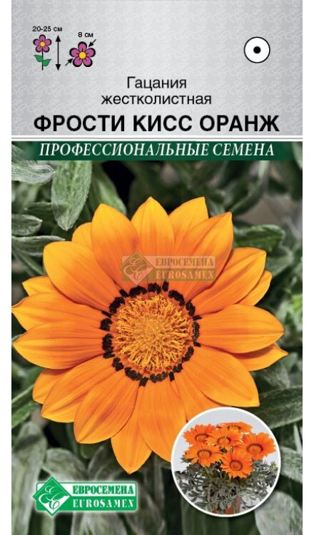 Уникальная серия гацании, которая при облачной погоде даже с закрытыми цветками, выгодно смотрится на клумбах за счет своей ажурной листвы серебристого цвета. Фрости Кисс - раннецветущая и самая однородная серия среди гацаний с серебристым листом на рынке. Это сорт с компактным шаровидным габитусом и крепкими соцветиями оранжевой окраски, продолжительностью выращивания 8-10 недель. Отличается беспрерывным образованием новых соцветий. Соцветия-корзинки по одному сидят на цветоносах, внешняя сторона лепестков оранжевого цвета, а внутренняя их часть несет на себе кольцо коричневого цвета. Листья снизу ворсистые, серебристо-белые. Зацветает рано и цветет длительное время, хорошо переносит засуху, а также плохую погоду, сохраняя декоративность даже холодным дождливым летом, ее можно пересаживать во время цветения. Хорошо смотрится в самой разной посуде: цветочных горшках, оконных ящиках и является отличным украшением альпинариев, рокариев и бордюров.