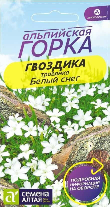 Элегантный нежный многолетник. Растение имеет вид куста, состоящего из нескольких стеблей длиной до 20 см. Листья линейно-ланцетные шириной около 3 мм образуют прикорневые розетку и имеют бледно-зеленый оттенок. На каждом побеге расположено по одному соцветию. Цветки белые мелкие, 2-2,5 см в диаметре, душистые. Используется для посадки на каменистых горках, в рокариях, балконных ящиках, между плитами мощения. Светолюбивое, морозостойкое растение, переносит холода до -35°С, не нуждается в укрытии на зиму. Устойчиво к засухе, не требует частых поливов. Гвоздика травянка неприхотлива, одинаково хорошо чувствует себя в лесу, саду, поле и горной местности. Предпочитает открытые солнечные участки и легкие дренированные почвы с низкой кислотностью. Выращивают посевом семян в открытый грунт с середины апреля до конца мая, когда минуют холода. Глубина заделки 0,5-1,5 см. При температуре +18…+20°C всходы появляются на 7-14 день. После появления на сеянцах двух настоящих листочков всходы пикируют или прореживают, оставляя между растениями 25-30 см. Период цветения составляет 1,5 месяца (с июня по июль). Допустим подзимний посев в октябре: семена за зиму пройдут естественную стратификацию и ранней весной появятся дружные всходы.
