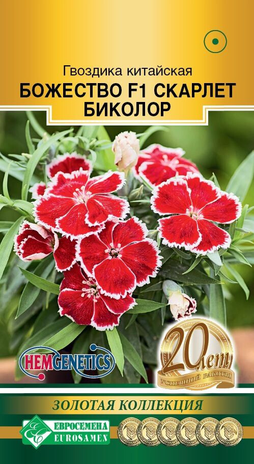 Генетически компактная серия Божество (Divinity) представляет собой новое поколение гвоздики китайской с улучшенными характеристиками, отличающаяся ранним цветением и крупным размером цветка, широким спектром окрасок, низкорослым габитусом и однородностью. Для выращивания этой гвоздики практически не требуется регуляторов роста растений, хорошо подходит для выращивания в кассетах и небольших горшках, отлично транспортируется. Рекомендуется для украшения альпинариев и рокариев. Очень естественно смотрится на искусственных ландшафтах, особенно в японском саду камней. Она востребована и на клумбах, где необходимо непрерывное цветение. Отличается высокими декоративными качествами, устойчивостью к жаре, дождю и холоду. Скарлет Биколор- очень яркая, восхитительная окраска в этой серии, которая, без сомнения, полюбится всем.