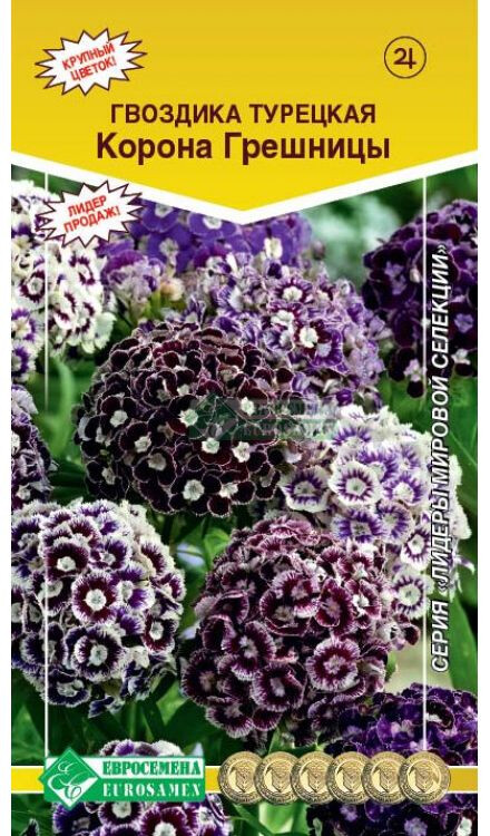 Dianthus barbatus Hollandia Purple Crown Турецкая гвоздика – популярное в садовой культуре растение семейства гвоздичных, которое можно часто встретить в садовых клумбах в палисадниках или деревенских огородах. В культуре она широко использовалась уже в XVI в. Растение многолетнее, но в нашем климате ее принято выращивать как двулетник. В первый год после посева растение образует розетку листьев, а на второй год после посева гвоздика цветет. По весне кустики этого растения превращаются в густой и насыщенный ковер, эффектно оттеняющий зелень газона и низко растущих кустарников. Корона Грешницы - отличается своими необыкновенными, крупными, шаровидными соцветиями, сочетающими в себе несколько тонов и полутонов цвета: от очень яркой окраски до чистой белой. Обильное цветение, необычная окраска и форма цветков, легкий цветочный аромат и возможность использовать в срезке - лучшая демонстрация красоты этого благородного цветка. Высота растения-50 см Диаметр цветка-11 см