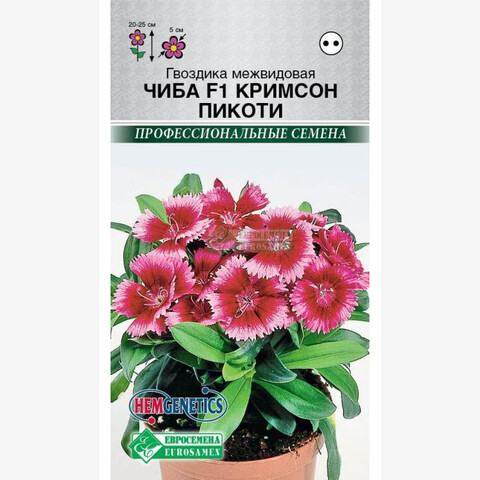 Серия гвоздики Чиба – это межвидовой гибрид гвоздики с самым ранним цветением, очень компактным габитусом растений и хорошим ветвлением. Отличается мощными цветоносами с множеством прекрасных цветков, малиновых в центре и белых по краям зубчатых лепестков. Растения отлично приживаются и быстро разрастаются, выпуская обилие бутонов с апреля до осени. Цветение обильное и продолжительное, устойчивость к непогоде высокая. Относительно небольшая высота растения, позволяет выращивать его как горшечное, а также использовать для оформления бордюров и озеленения всевозможных клумб. Выращивая ее рассадным способом, можно получить растения с цветением уже в это же лето. Семенной материал с высокими показателями всхожести и сортовой чистоты.