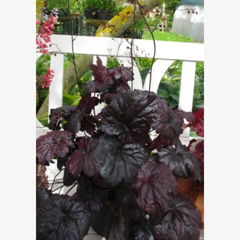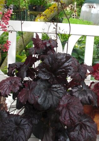 • бордово-черные крупные листья, цветки кремовые на красных стебельках Н-35см,W-50см