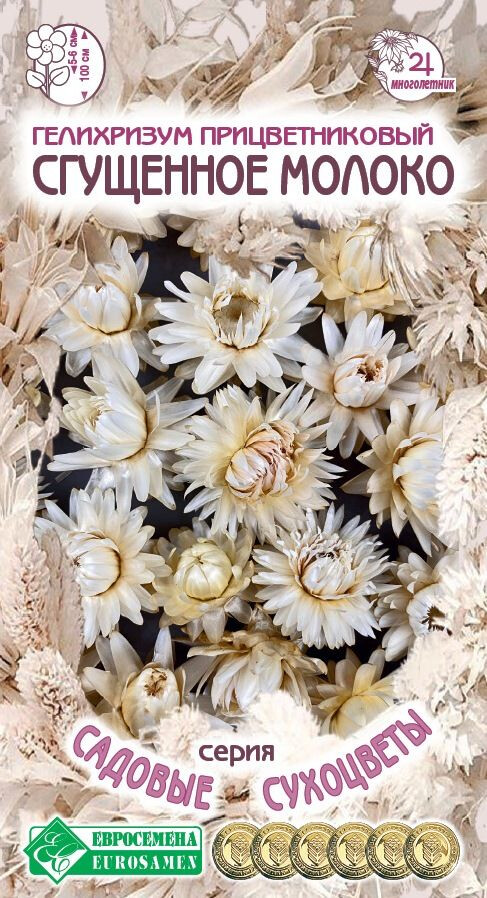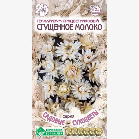 Гелихризум - растение, называемое цветоводами чаще всего бессмертником, принадлежит к обширному семейству Астровые. Родиной является далекая Австралия. Название этого растения произошло от греческих слов гелиос – солнце и хризос – золото. Гелихризум – давно выращиваемое декоративное растение, которое введено в культуру с конца XVIII века. Оно считается одним из лучших цветков для сухих букетов. Растение многолетнее, но в наших условиях культивируется как однолетнее. Сгущенное Молоко - бессмертник, каждый побег которого снабжен соцветием-корзинкой, похожей на маленькое солнце, поэтому и названо именем древнегреческого бога солнца Гелиоса. Растение не вянет и не теряет окраски даже тогда, когда срезано. Цветение обильное с июля и до заморозков. Цветоводы стремятся в основном выращивать махровые формы, а для сухих букетов и композиций особенно хороши сорта, имеющие чистые тона с глянцевым блеском.