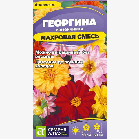 Яркий садовый однолетник с компактной формой куста. Растение образует многочисленные ветвистые побеги высотой 40-50 см, увенчанные эффектными крупными махровыми соцветиями диаметром до 10 см розовой, красной, пурпурно-карминной, оранжевой, белой окраски. Георгина незаменима в парадных цветниках, миксбордерах, рабатках, группах второго плана, используется для срезки. Свето- и теплолюбивое растение. Предпочитает открытые солнечные участки с питательной суглинистой почвой, защищенные от ветра, но с хорошей циркуляцией воздуха. Выращивают как рассадным способом, так и прямым посевом семян в грунт. На рассаду семена высевают в конце марта - апреле. Для посева подойдет лёгкий воздухопроницаемый грунт, можно смешать обычный грунт из огорода с чистым песком, перлитом и вермикулитом. Грунт обязательно дезинфицируют: прокаливают в духовке, либо проливают раствором марганцовки или фунгицида. Можно сеять как в рассадные контейнеры, так и в отельные торфяные или одноразовые стаканчики. В последнем случае рассаду не надо пикировать. Семена высевают с интервалом 3-4 см, сверху заделывают грунтом, который слегка уплотняют, глубина заделки – 0,5 см. Посевы увлажняют теплой водой из пульверизатора и накрывают пленкой. Рассадные емкости помещают в светлое теплое место. Ежедневно пленку снимают для проветривания посевов и удаления конденсата. При температуре почвы +18-20°С всходы появляются на 7-14 день. Сеянцы пикируют в фазе двух настоящих листочков. Высадку рассады в открытый грунт проводят в июне, когда минует угроза возвратных заморозков. Посадочный интервал 25-30 см. Возможен прямой посев семян в открытый грунт в мае, но при этом цветение будет более поздним. Цветение длительное, с июня до осенних холодов. Для продления цветения увядшие цветки рекомендуется удалять.