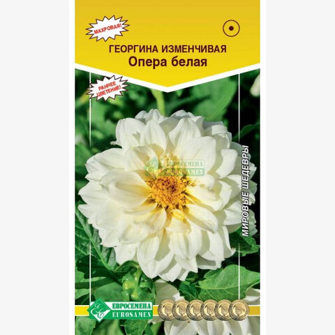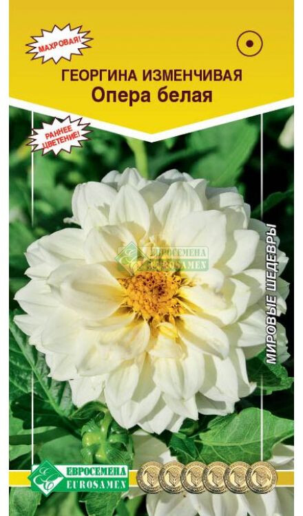 Dahlia variabilis double Opera White Трудно найти садовода, который бы равнодушно относился к георгинам. Что же касается продолжительности цветения, то георгина не имеет себе равных. Пламенная игра махровых и полу махровых белых цветов, переливающихся на солнце, сразу привлечет внимание всех. Необычайно жизнерадостный георгин! Освещенный лучами заходящего солнца, он великолепен! Цветущие кусты георгин производят ошеломляющий эффект. Одновременно цветет до 15 цветков на одном растении. Даже в пасмурные дни будет дарить вам отличное настроение и радость от общения с ним. Эта культура способна украсить любой цветник и самый скромный уголок сада. При ранней прищипке растения приобретают особый объем. Георгины великолепны в контейнерах, вазонах, бордюрах и клумбах. Рекомендуется для групповой посадки и срезки. Высота растения-35 см Диаметр цветка-8-9 см