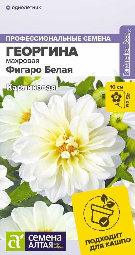Раннецветущая карликовая георгина. Формирует компактные хорошо ветвящиеся кустики с крупными махровыми белыми цветами. Отлично смотрится в бордюрных посадках, композициях, балконных ящиках, вазонах и кашпо. Высота растения: 35-45 см Диаметр цветка: 8-10 см Условия выращивания, место посадки: солнечные участки, полутень Требования к грунту: питательный легкий грунт с нейтральной или слабокислой реакцией Способы выращивания: рассадный, безрассадный Время посева на рассаду: март-апрель Время посева в грунт: май Способ посева: семена высевают на уплотненное ложе увлажненного грунта, заделывая на глубину 0,3-0,6 см. Увлажняют из опрыскивателя. Емкость накрывают прозрачной крышкой или пленкой до появления первых всходов, периодически проветривают. При раннем посеве на рассаду обеспечивают досветку 8-10 часов и температуру 20-23°С. Время до появления всходов: 3-7 дней Перевалка: при появлении 1-2 пар настоящих листьев, через 4-5 недель от появления всходов. Объем индивидуальных емкостей при доращивании не менее 0,5 л Время высадки в открытый грунт: май-июнь Посадочное расстояние: 25-35 см Период цветения: май-сентябрь Уход: первую подкормку фосфорно-калийным удобрением проводят в начале бутонизации. Далее – 1 раз в 14-20 дней. Рекомендуется удалять увядшие соцветия.