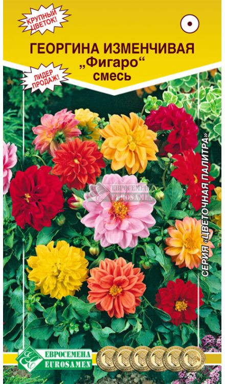 Вряд ли можно найти человека, который не любил бы георгины. Вы испытаете истинное наслаждение от фейерверка фантастических красок этой замечательной махровой смеси георгин Фигаро. Пышные и крупные цветки переливаются радугой ярких цветов. Освещенные лучами заходящего солнца, они великолепны! Что же касается продолжительности цветения, то георгин не имеет себе равных, одновременно цветет до 15 цветков на одном растении. Даже в пасмурные дни будет дарить хорошее настроение. Незаменима в клумбах, рабатках и бордюрах, пригодна для срезки.