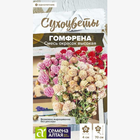 Сухоцвет. Травянистое растение, выращиваемое в культуре как однолетник. Образует сильноветвистые кустики высотой до 70 см. Стебли прямостоячие, листья удлиненно-эллиптической формы, опушенные. Ароматные соцветия головчатой формы диаметром 3-4 см состоят из цветков, окрашенных в красный, розовый, белый, пурпурный цвета, зачастую окрас неравномерный. Растение декоративно не только в композициях из сухоцветов, но и на клумбах, бордюрах. Засушенные соцветия хорошо сохраняют окраску и форму. Светолюбивое растение. Лучше развивается на удобренных и хорошо дренированных, умеренно влажных почвах, не выносит кислых и малоплодородных почв. Выращивается через рассаду. Посевы проводят в конце февраля - начале марта под пленку (до появления всходов), периодически проветривая. Сеять лучше сразу в индивидуальные контейнеры. Семена лишь слегка вдавливают в хорошо увлажненный грунт, посевы содержат при температуре +18-22оС и постоянной умеренной влажности. Проращивать лучше на свету (для прорастания семенам необходимо хотя бы немного света). Всходы появляются через 15-18 дней. Сеянцы содержат при умеренной температуре. В открытый грунт рассаду высаживают в конце мая-начале июня, когда минуют возвратные заморозки. Расстояние между растениями 30-35 см. В конце мая можно высевать семена непосредственно в открытый грунт. Цветение с июля по октябрь.