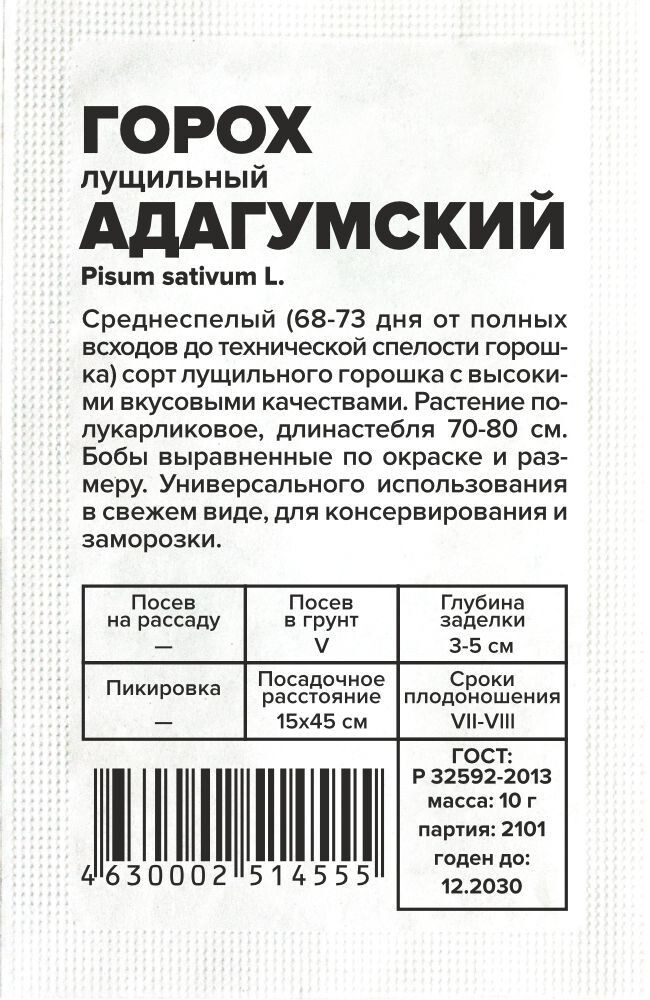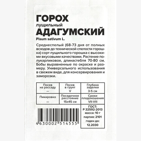 Среднеспелый (68-73 дня от полных всходов до технической спелости горошка) сорт лущильного горошка с высокими вкусовыми качествами. Растение полукарликовое, длина стебля 70-80 см. Бобы выравненные по окраске и размеру. Универсального использования в свежем виде, для консервирования и заморозки. Место посадки: предпочитает плодородные очень легкие и легкие почвы с нейтральной или слабокислой реакцией. Очень важна хорошая аэрация и обеспеченность влагой в течение вегетации. Горох накапливает в почве азот, поэтому их можно располагать на истощенных почвах, после картофеля, моркови, лука, томатов Освещение: предпочитает солнечные участки Предпосевная подготовка: не требуется, возможно замачивание на сутки Сроки посева: начало мая, когда температура почвы прогреется выше 5°С Посев на рассаду: не предусмотрено Посев в грунт: высевают в открытый грунт в начале мая. Глубина заделки семян составляет 3-4 см на тяжелых и 4-5 см на легких почвах. Семена прорастают при температуре 2-5°С, всходы выдерживают кратковременные заморозки до -6°С. Расстояние между растениями не менее 15 см, между рядками 45 см Пикировка/перевалка: не требуется, сеют сразу в грунт Уход: полив регулярный, обильный. Обязательно бороться с сорняками, особенно вьющимися. Для высокорослых сортов рекомендуется создавать опору