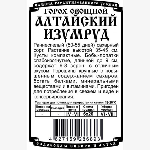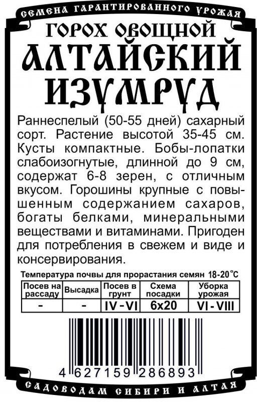 Раннеспелый, сахарный сорт, период от всходов до технической спелости 50-55 дней. Растение высотой 35-45 см. Кусты компактные. Бобы-лопатки слабоизогнутые, Бобы-лопатки слабоизогнуты, длинной до 9 см. Горошины крупные с повышенным содержанием сахаров, богаты белками, минеральными веществами и витаминами. Пригоден для потребления в свежем и виде и консервирования.