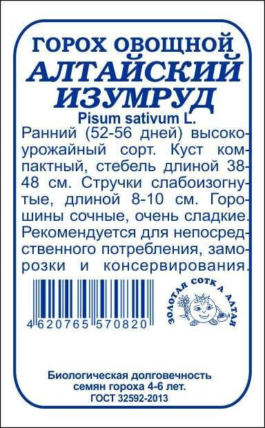 Очень вкусный высокоурожайный сорт. От всходов до технической годности 52-56 дней. Растение компактное, стебель высотой 38-48 см. Стручки слабоизогнутые, с заостренной верхушкой, длиной 8-10 см. Горошины темно-зеленые, выравненные по размеру, крупные, сочные и очень сладкие. Сорт рекомендуется для непосредственного потребления, консервирования и замораживания в фазе молочно-восковой спелости.