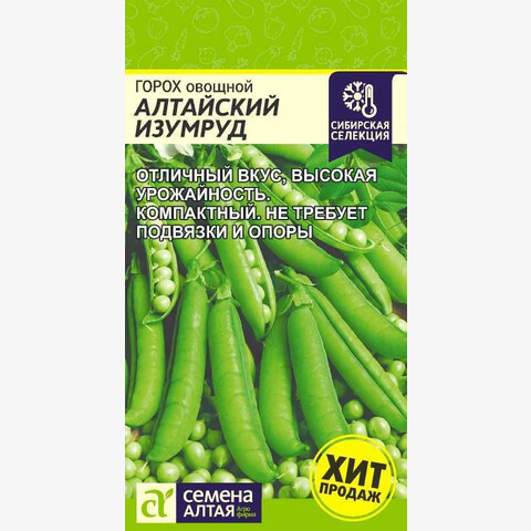 Селекции Западносибирской овощной опытной станции. Среднеспелый, от всходов до технической спелости 52-56 дней, сорт. Растение до 50 см высотой. Бобы слабоизогнутые, длинные, широкие, горошек сладкий, темно-зеленый, содержит сахара 5,5-6,2%. Ценность сорта: высокая урожайность, высокие вкусовые качества горошка в свежем, замороженном и консервированном виде. Место посадки: предпочитает плодородные очень легкие и легкие почвы с нейтральной или слабокислой реакцией. Очень важна хорошая аэрация и обеспеченность влагой в течение вегетации. Горох накапливает в почве азот, поэтому их можно располагать на истощенных почвах, после картофеля, моркови, лука, томатов Освещение: предпочитает солнечные участки Предпосевная подготовка: не требуется, возможно замачивание на сутки Сроки посева: начало мая, когда температура почвы прогреется выше 5°С Посев на рассаду: не предусмотрено Посев в грунт: высевают в открытый грунт в начале мая. Глубина заделки семян составляет 3-4 см на тяжелых и 4-5 см на легких почвах. Семена прорастают при температуре 2-5°С, всходы выдерживают кратковременные заморозки до -6°С. Расстояние между растениями не менее 15 см, между рядками 45 см Пикировка/перевалка: не требуется, сеют сразу в грунт Уход: полив регулярный, обильный. Обязательно бороться с сорняками, особенно вьющимися. Для высокорослых сортов рекомендуется создавать опору