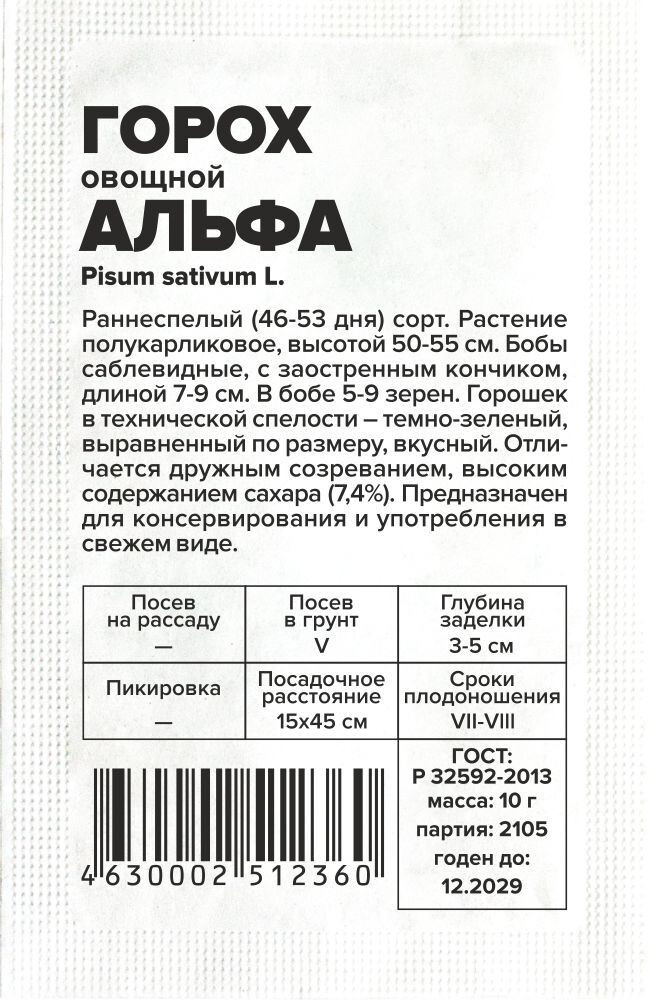 • Раннеспелый (46-53 дня) сорт. Растение полукарликовое, высотой 50-55 см. Бобы саблевидные, с заостренным кончиком, длиной 7-9 см. В бобе 5-9 зерен. Горошек в технической спелости —темно-зеленый, выравненный по размеру, вкусный. Отличается дружным созреванием, высоким содержанием сахара (7,4%). Предназначен для консервирования и употребления в свежем виде. Место посадки: предпочитает плодородные очень легкие и легкие почвы с нейтральной или слабокислой реакцией. Очень важна хорошая аэрация и обеспеченность влагой в течение вегетации. Горох накапливает в почве азот, поэтому их можно располагать на истощенных почвах, после картофеля, моркови, лука, томатов Освещение: предпочитает солнечные участки Предпосевная подготовка: не требуется, возможно замачивание на сутки Сроки посева: начало мая, когда температура почвы прогреется выше 5°С Посев на рассаду: не предусмотрено Посев в грунт: высевают в открытый грунт в начале мая. Глубина заделки семян составляет 3-4 см на тяжелых и 4-5 см на легких почвах. Семена прорастают при температуре 2-5°С, всходы выдерживают кратковременные заморозки до -6°С. Расстояние между растениями не менее 15 см, между рядками 45 см Пикировка/перевалка: не требуется, сеют сразу в грунт Уход: полив регулярный, обильный. Обязательно бороться с сорняками, особенно вьющимися. Для высокорослых сортов рекомендуется создавать опору