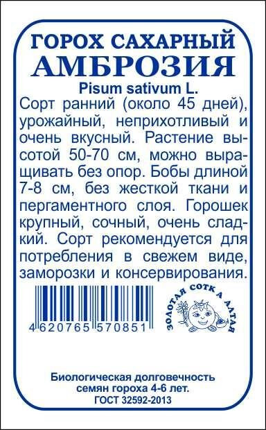 Сорт раннеспелый, урожайный, неприхотливый и очень вкусный. Срок созревания около 45 дней. Растение высотой 50-70 см, можно выращивать без опор. Бобы длиной 7-8 см, без жесткой ткани и пергаментного слоя. Горошины крупные, сочные, очень сладкие. Сорт рекомендуется для непосредственного потребления, заморозки и консервирования как лопаток (в фазе молочно-восковой спелости), так и горошин.