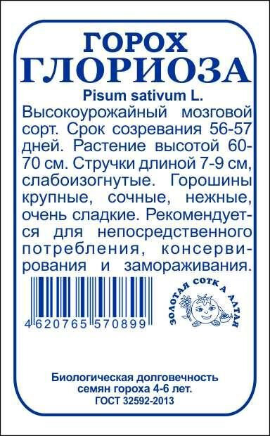Высокоурожайный мозговой сорт, созревающий через 56-57дней. Растение высотой 60-70 см. Стручки длиной 7-9 см, слабоизогнутые с острой верхушкой. Горошек сочный, нежный и очень сладкий. Сорт рекомендуется для непосредственного потребления, консервирования и замораживания. Ценится за стабильную урожайность и дружное созревание.