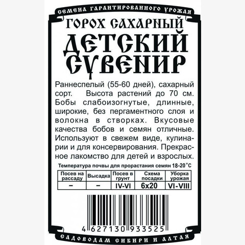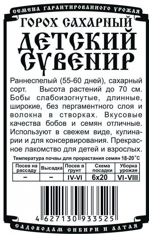 Раннеспелый (55-60 дней), сахарный сорт. Высота растений до 70 см. Бобы слабоизогнутые, длинные, широкие, без пергаментного слоя и волокна в створках. Вкусовые качества бобов и семян отличные. Используют в свежем виде, кулинарии и для консервирования. Прекрасное лакомство для детей и взрослых.