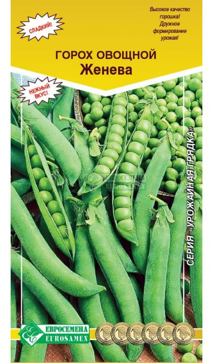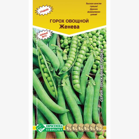 Горох – одно из самых древних растений на Земле. Многие века сытный и простой в выращивании горох спасал от голода едва ли не всех обитателей планеты: его ели в Китае и в Гималаях, в обеих Америках и в Европе. Мудрые предки знали и о целительных свойствах гороха: великий Гиппократ лечил им малокровие, ожирение, заболевания сердца и щитовидной железы. Горох – один из самых богатых источников растительного белка, необходимого организму в качестве строительного материала для мышц и костей. Женева- самый вкусный и самый урожайный сорт мозгового горошка, очень популярен среди производителей консервированного горошка. Растение до 1,2 м высотой, первые стручки формируются на высоте 35-40 см. В каждой пазухе по 2-3 стручка, темно-зеленого цвета. В каждом стручке по 9-12 горошин, средний размер горошин около 8 мм. Сорт устойчив к пониженным температурам и фузариозу. Отличная переносимость высоких температур. Отличается отменным сладким нежным вкусом и очень высоким урожаем. Рекомендуется для потребления в свежем виде, переработки и заморозки.