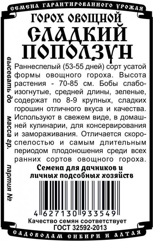 Раннеспелый (53-55 дней) сорт усатой формы овощного гороха. Высота растения - 70-85 см. Бобы слабоизогнутые, средней длины, зеленые, содержат по 8-9 крупных, сладких горошин отличного вкуса и качества. Используют в свежем виде, в домашней кулинарии, для консервирования и замораживания. Отличается скороспелостью и самым длительным периодом плодоношения среди всех ранних сортов овощного гороха.