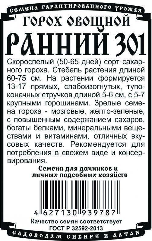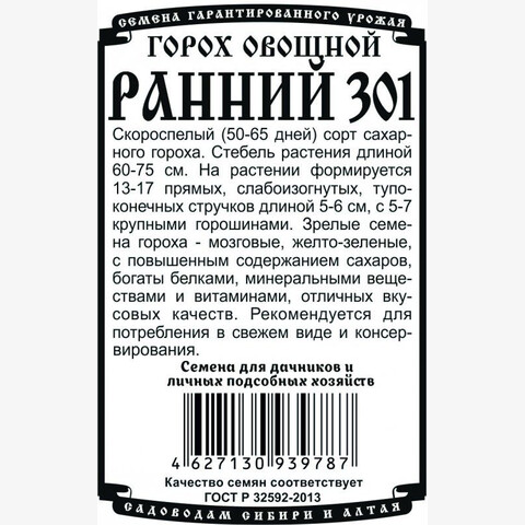 Скороспелый (50-65 дней) сахарного сорт. Стебель растения длиной 60 - 75 см. На растении формируется 13-17 прямых, слабоизогнутых, тупоконечных стручков длиной 5-6 см, с 5-7 крупными горошинами. Зрелые семена гороха - мозговые, желто-зеленые, с повышенным содержанием сахаров, богаты белками, минеральными веществами и витаминами, отличных вкусовых качеств. Рекомендуется для потребления в свежем виде и консервирования.