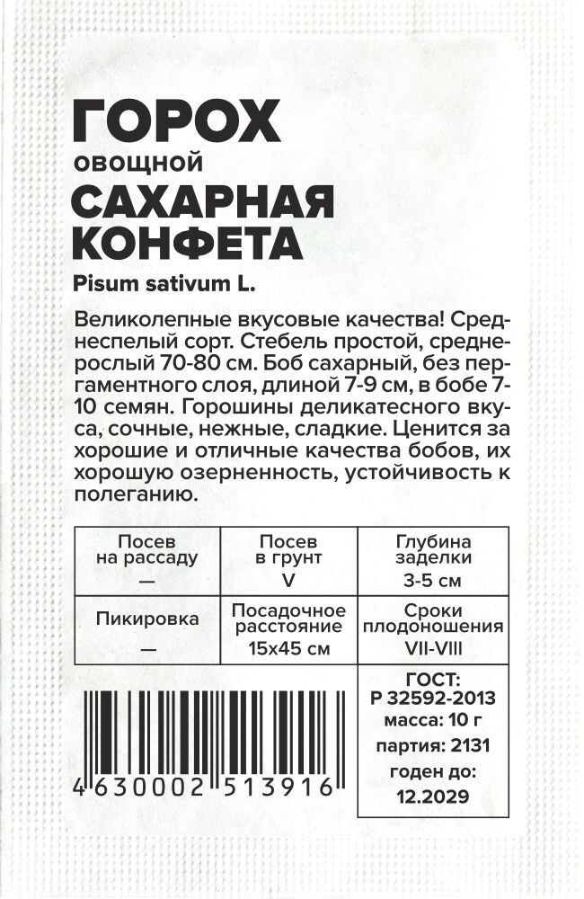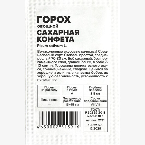 • Великолепные вкусовые качества! Среднеспелый сорт. Стебель простой, среднерослый 70-80 см. Боб сахарный, без пергаментного слоя, длиной 7-9 см, в бобе 7-10 семян. Горошины деликатесного вкуса, сочные, нежные, сладкие. Ценится за хорошие и отличные качества бобов, их хорошую озерненность, устойчивость к полеганию. Место посадки: предпочитает плодородные очень легкие и легкие почвы с нейтральной или слабокислой реакцией. Очень важна хорошая аэрация и обеспеченность влагой в течение вегетации. Горох накапливает в почве азот, поэтому их можно располагать на истощенных почвах, после картофеля, моркови, лука, томатов Освещение: предпочитает солнечные участки Предпосевная подготовка: не требуется, возможно замачивание на сутки Сроки посева: начало мая, когда температура почвы прогреется выше 5°С Посев на рассаду: не предусмотрено Посев в грунт: высевают в открытый грунт в начале мая. Глубина заделки семян составляет 3-4 см на тяжелых и 4-5 см на легких почвах. Семена прорастают при температуре 2-5°С, всходы выдерживают кратковременные заморозки до -6°С. Расстояние между растениями не менее 15 см, между рядками 45 см Пикировка/перевалка: не требуется, сеют сразу в грунт Уход: полив регулярный, обильный. Обязательно бороться с сорняками, особенно вьющимися. Для высокорослых сортов рекомендуется создавать опору
