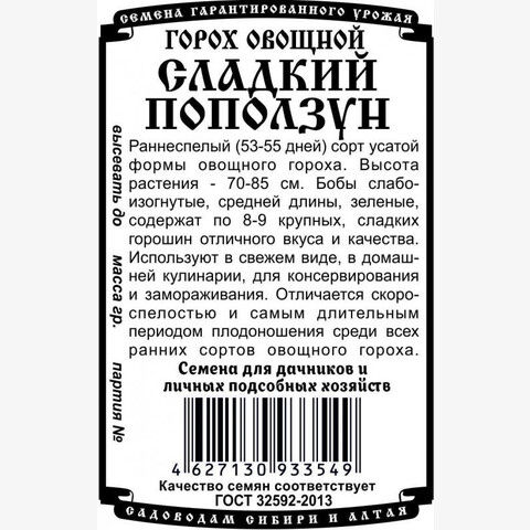 Раннеспелый (53-55 дней) сорт усатой формы овощного гороха. Высота растения - 70-85 см. Бобы слабоизогнутые, средней длины, зеленые, содержат по 8-9 крупных, сладких горошин отличного вкуса и качества. Используют в свежем виде, в домашней кулинарии, для консервирования и замораживания. Отличается скороспелостью и самым длительным периодом плодоношения среди всех ранних сортов овощного гороха.