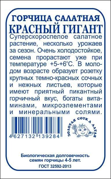 Суперскороспелое салатное растение, несколько урожаев за сезон. Очень холодостойкое, семена прорастают уже при температуре +5-+6оС. В молодом возрасте образует розетку крупных темно-красных сочных и нежных листьев, которые имеют приятный пикантный горчичный вкус, богаты витаминами, микроэлементами и минеральными солями.