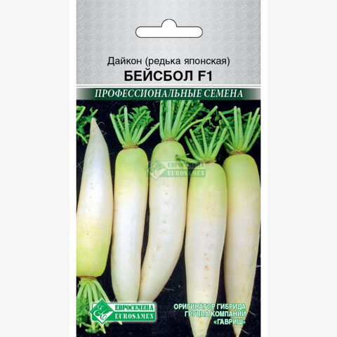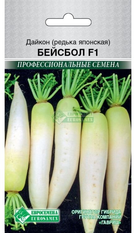 Дайкон – это японская редька. Данный овощ является корнеплодным растением семейства крестоцветные. В составе дайкона горчичные эфирные масла содержатся в минимальном количестве, поэтому этот продукт значительно нежнее и вкуснее, чем та редька, к которой мы привыкли. Мякоть у овоща хрустящая и освежающая, в верхней части вкус сладковатый, а около корня – более острый. Этот вид был получен в Японии с помощью селекции. Бейсбол- гибрид редьки с устойчивостью к ложной мучнистой росе и мягкой гнили, отличающийся жаростойкостью, высокой устойчивостью к растрескиванию и возможностью хранения в полевых условиях более 2-х месяцев. От всходов до получения товарной продукции 60-65 дней. Корнеплоды белого цвета, цилиндрической формы, длиной 27-30 см, массой 700-800 грамм. Мякоть сочная, приятного полуострого вкуса.