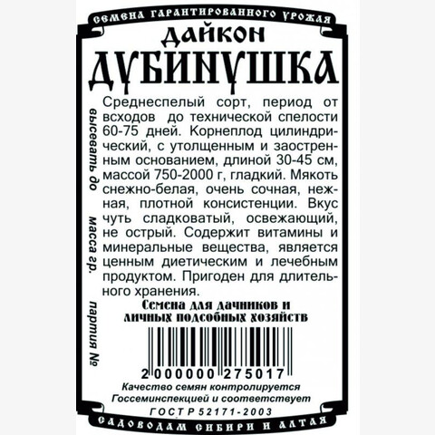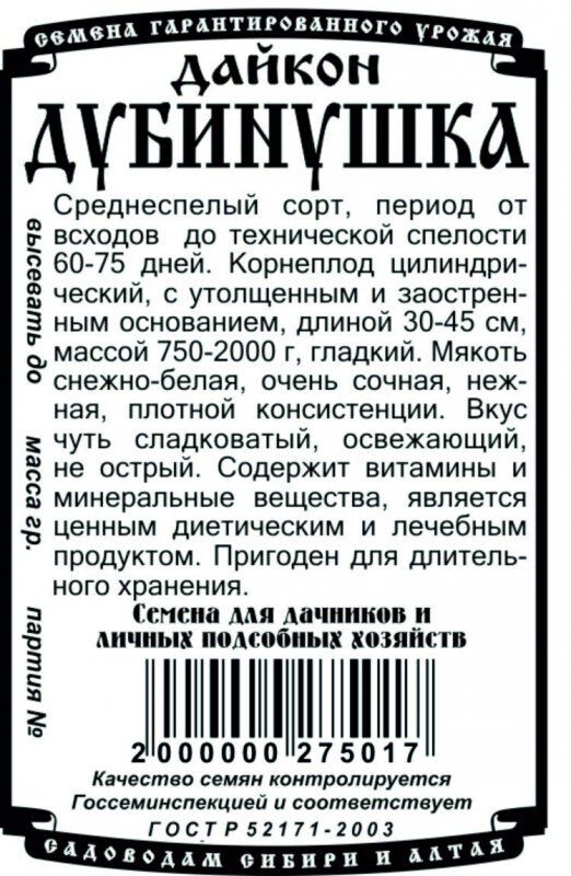 • Среднеспелый. Корнеплод цилиндрический с утолщенным заостренным основанием длинной 30-45см, гладкий, масса 750-2200г. Основная окраска белая. Мякоть снежно-белая, сочная, нежная, плотная. Вкус сладковатый без острого привкуса. Пригоден для длит. хранения.