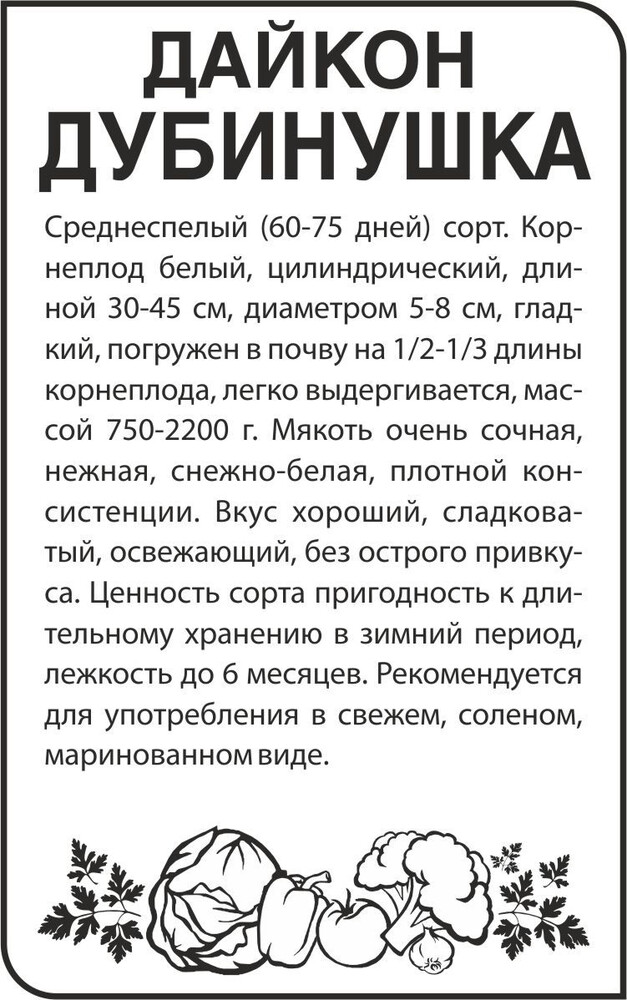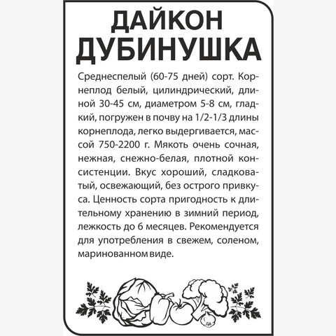 Среднеспелый (60-75 дней) сорт. Корнеплод белый, цилиндрический, длиной 30-45 см, диаметром 5-8 см, гладкий, погружен в почву на 1/2 -1/3 длины корнеплода, легко выдергивается, достигает массы до 2,2 кг. Мякоть очень сочная, нежная, снежно-белая, плотной консистенции. Вкус хороший, сладковатый, освежающий, без острого привкуса. Ценность сорта: пригодность к длительному хранению в зимний период, лежкость до 6 месяцев. Рекомендуется для употребления в свежем, соленом, маринованном виде. Место посадки: хорошо растет на тяжелых нейтральных почвах. Можно размещать после любых овощных культур, кроме крестоцветных: капусты, репы, редиса Освещение: предпочитает солнечные участки, выносит затенение Предпосевная подготовка: не требуется Сроки посева: вторая половина июня (при длинном световом дне). Среднеспелые сорта при слишком ранних сроках посева могут зацвести и не формировать корнеплод Посев на рассаду: не предусмотрено Посев в грунт: сеют в борозды глубиной 2-3 см, семена раскладывают на увлажненный грунт, присыпают землей и хорошо уплотняют. Растения размещают на расстоянии 15 см и междурядья 30 см Пикировка/перевалка: не предусмотрена, так как сеют сразу в грунт Уход: при проявлении первого настоящего листа всходы прореживают (если посев был слишком густым). Использование свежих органических удобрений под дайкон не рекомендуется, так как они вызывают дуплистость и загнивание корнеплода