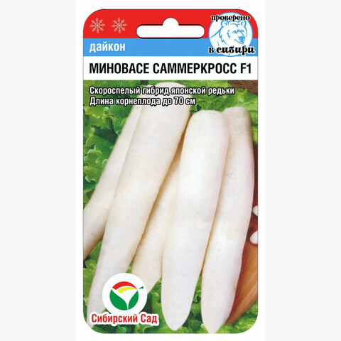 Скороспелый гибрид японской редьки. От массовых всходов до уборки урожая 40-45 дней. Корнеплоды белые, цилиндрические, гладкие, сочные и нежные, без острого редечного вкуса. Длина корнеплодов данного гибрида может достигать 70 см, поэтому перед посевом необходимо глубоко обрабатывать почву. Дайкон используют в свежем, вареном и солёном виде, прекрасно хранят до весны. В лечебных целях дайкон, как и редьку, используют при простуде, для укрепления волос, при заболеваниях желчного пузыря, печени и почек. Семена сеют в середине июля, (при длинном дне дайкон сильно стеблюется). Ширина междурядий 40 см. Глубина заделки семян 2 см. Продолжительность прорастания 8-10 дней. С появлением 2-3 настоящих листьев посевы прореживают, оставляя 30 см между растениями. Редька требует глубокообработанных почв. Не рекомендуется вносить свежий навоз. Необходимы регулярные поливы. При недостатке влаги усиливается горечь корнеплодов. Для ускорения процесса всхожести семян, оздоровления растений, улучшения завязываемости плодов рекомендуется пользоваться специально разработанными стимуляторами роста и развития растений.