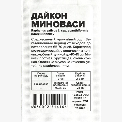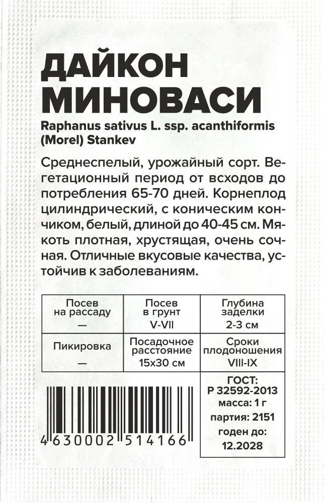 Среднеспелый урожайный сорт. Вегетационный период от всходов до потребления 65-70 дней. Корнеплод цилиндрический, с коническим кончиком, белый, длиной до 40-45 см. Мякоть плотная, хрустящая, очень сочная. Отличные вкусовые качества, устойчив к заболеваниям. Место посадки: хорошо растет на тяжелых нейтральных почвах. Можно размещать после любых овощных культур, кроме крестоцветных: капусты, репы, редиса Освещение: предпочитает солнечные участки, выносит затенение Предпосевная подготовка: не требуется Сроки посева: вторая половина июня (при длинном световом дне). Среднеспелые сорта при слишком ранних сроках посева могут зацвести и не формировать корнеплод Посев на рассаду: не предусмотрено Посев в грунт: сеют в борозды глубиной 2-3 см, семена раскладывают на увлажненный грунт, присыпают землей и хорошо уплотняют. Растения размещают на расстоянии 15 см и междурядья 30 см Пикировка/перевалка: не предусмотрена, так как сеют сразу в грунт Уход: при проявлении первого настоящего листа всходы прореживают (если посев был слишком густым). Использование свежих органических удобрений под дайкон не рекомендуется, так как они вызывают дуплистость и загнивание корнеплода