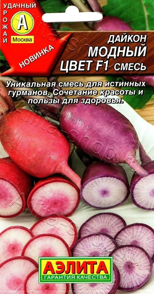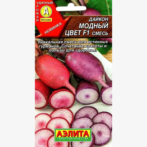 Особенная смесь гибридов дайкона для настоящих гурманов! Отличный ингредиент любой диеты. Сочетание пользы и красоты. Урожай готов к уборке через 65-70 дней после посева семян. Корнеплоды длиной 12-15 см, массой 120-180 г. Мякоть с яркой сердцевиной, аппетитная, сочная, сбалансированного вкуса. Смесь неприхотливая, устойчивая к заболеваниям, идеальная для приготовления свежих салатов. Интенсивность окраски сердцевины корнеплодов усиливается по мере созревания.