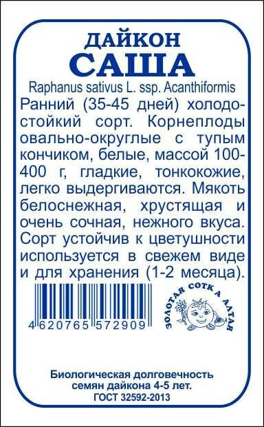 Сорт ранний, холодостойкий. От всходов до технической спелости 35-45 дней. Корнеплоды белые, овально-округлые с тупым кончиком, гладкие, массой 100-400 г, легко выдергиваются. Мякоть белоснежная, очень сочная, хрустящая, приятного нежного вкуса. Кожица тонкая. Сорт используется в свежем виде и для хранения (1-2 месяца).