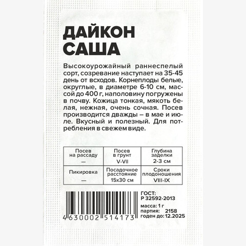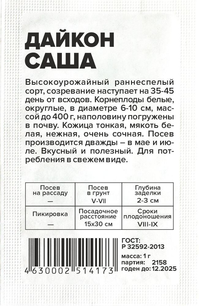 Высокоурожайный раннеспелый сорт, созревание наступает на 35-45 день от всходов. Корнеплоды белые, округлые, в диаметре 6-10 см, массой до 400 г, наполовину погружены в почву. Кожица тонкая, мякоть белая, нежная, очень сочная. Вкусный и полезный. Для потребления в свежем виде. Место посадки: хорошо растет на тяжелых нейтральных почвах. Можно размещать после любых овощных культур, кроме крестоцветных: капусты, репы, редиса, дайкона Освещение: предпочитает солнечные участки, выносит затенение Предпосевная подготовка: не требуется Сроки посева: раннеспелые сорта высевают после оттаивания грунта (апрель-май) либо в конце июля - начале августа (после сокращения светового дня) Посев на рассаду: не предусмотрено Посев в грунт: сеют в борозды, семена раскладывают на увлажненный грунт, присыпают землей, глубина заделки 2-3 см. Между растениями оставляют 15 см, между рядами 30 см Пикировка/перевалка: не предусмотрена, так как сеют сразу в грунт Уход: при проявлении первого настоящего листа всходы прореживают, оставляя расстояние между растениями 15 см. Использование свежих органических удобрений под дайкон не рекомендуется, так как они вызывают дуплистость и загнивание корнеплода