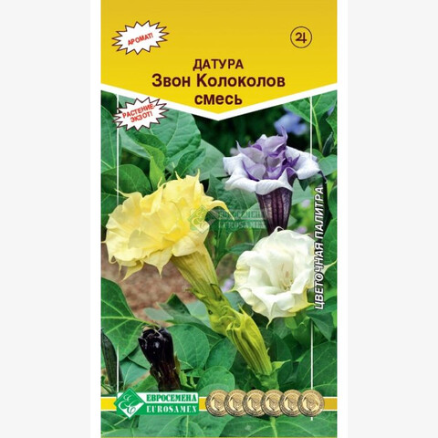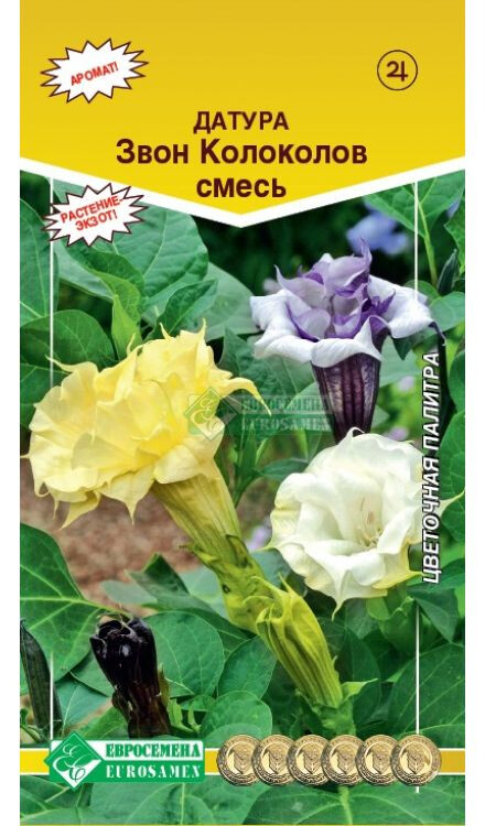 Огромные чудо-колокола датуры или, в русском варианте — дурман-травы, украшают наши сады с июня вплоть до первых заморозков. Увидев это удивительное растение однажды, отказаться от него уже не получится. Каждый вечер огромные цветки датуры источают дивный тонкий аромат, обволакивающий и дурманящий. Датура- многолетнее растение, культивируемое в средней полосе России как однолетнее, имеющее мощную корневую систему и достигающее в высоту 1,5 м. Цветки у нее могут быть как белыми, так и желтыми и даже пурпурными по окрасу. Звон колоколов- махровая смесь датуры для использования в одиночных посадках на клумбах, вазонах, а также для украшения комнат, солнечных или полутенистых террас и зимних садов. Осторожно: все части растения ядовиты.