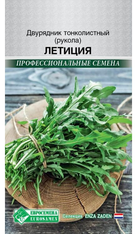 Рукола – одна из разновидностей салата. В России начала распространяться вместе с популярностью итальянских и средиземноморских кулинарных блюд. Летиция- сорт поздней руколы для выращивания в открытом и защищенном грунте , с вертикальными, темно-зелеными листьями и красивой насечкой на них, с высокой устойчивостью к стрелкованию, обладающий высокой послеуборочной сохранностью. Это продукт высокого качества с мягким вкусом, ярко выраженным ароматом и острым горчично-ореховым привкусом. Рекомендуется для использования зеленых молодых листьев в салатах и в качестве гарнира к мясным и рыбным блюдам, ее можно добавлять не только в соусы и приправы, ею украшают бутерброды и закуски, добавляют в супы и рагу, она является отличной начинкой для пирога. Важно! Чтобы листья руколы были не слишком горькими, кустики нужно очень часто поливать! Отличается высокой выравненностью растений, масса растения до 35 г. Урожайность зелени до 1,9 кг/кв. м