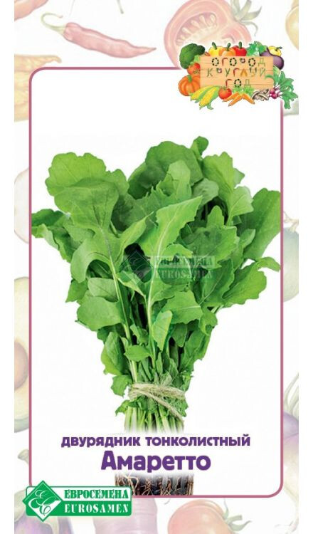 Каждая хозяйка хотела бы иметь свежую зелень в любое время года. Имея дачу или собственный огород можно баловать семью витаминными салатами на протяжении весенне-летнего периода. В зимнее же время нехватка витаминов и питательных веществ чувствуется особенно остро, поэтому все большей популярностью пользуются домашние мини-огороды на подоконниках и лоджиях, где любители земледелия умудряются вырастить почти весь дачный ассортимент овощей. Огород круглый год - модный тренд, занятие приятное и полезное, всегда под рукой пряная зелень к столу — и не нужно задумываться, как сохранить ее в свежем виде. Амаретто- раннеспелый сорт (25-28 дней) для выращивания в открытом и закрытом грунтах. Листовая пластинка лировидная, длиной 12-18 см, темно-зеленого цвета. Высокая концентрация эфирных масел в листьях придает им оригинальный орехово-горчичный горчичный вкус и высокую ароматичность. Регулярные поливы позволяют получать зелень с более тонким ароматом и гармоничным вкусом.