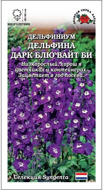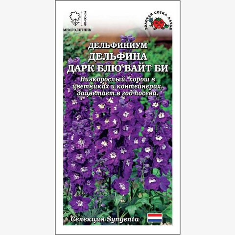 Очаровательный низкорослый дельфиниум, выращиваемый не только в цветниках, но и в контейнерах. Растения генетически компактные, ветвистые. Многочисленные сине-фиолетовые цветочки с белой пчёлкой в центре собраны в плотные соцветия высотой 15-20 см. Зацветает в год посева. Великолепен в срезке.