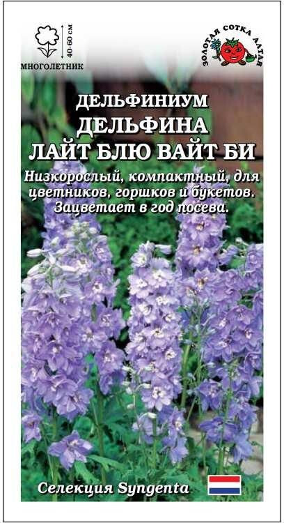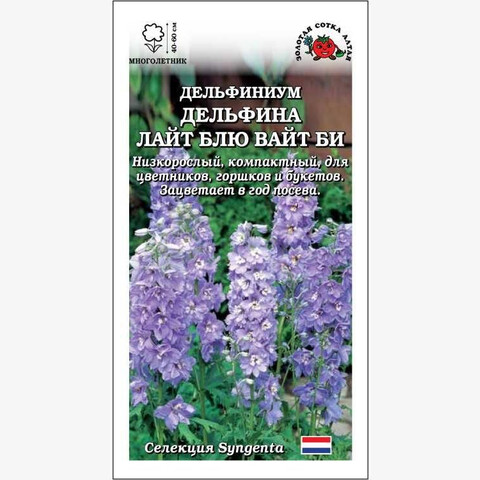 Прекрасный низкорослый дельфиниум для выращивания в цветниках и контейнерах, а также для срезки в букеты. Растения генетически компактные, ветвистые. Цветы многочисленные, нежного лилово-голубого цвета с белой пчёлкой в центре, собраны в плотные соцветия высотой 15-20 см. Зацветает в год посева.