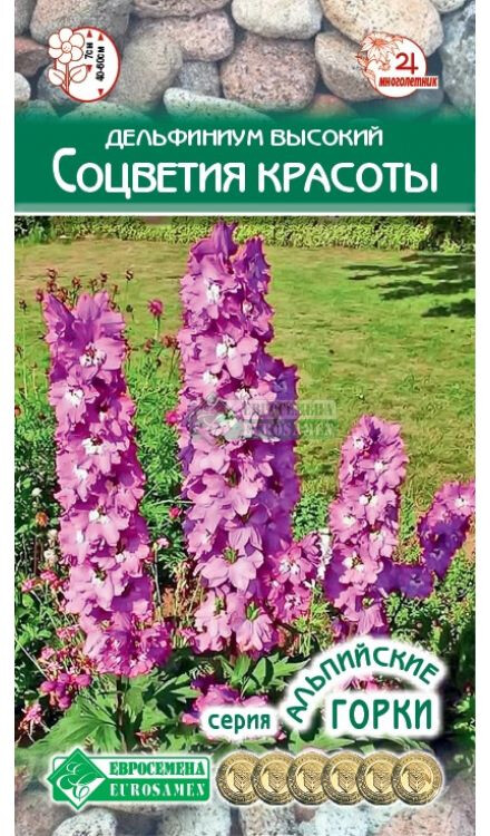 Дельфиниум высокий - многолетнее, декоративное растение семейства Лютиковые, покоряющее своей царственной статью и являющееся источником многих декоративных сортов в диапазоне цветов от сине-фиолетового окраса до розового, кремового и белого. Крупные цветки собраны в густые пирамидальные соцветия, отличающиеся красотой и продолжительностью цветения, прочностью цветоносов, за что и любимо особенно садовниками и цветоводами. Это чудесное растение традиционно выращивается в русских садах, популярно оно в качестве классического растения для заднего плана миксбордеров, великолепно сочетается с самыми различными многолетниками. В качестве соседей подойдут такие растения, как: нивяник, рудбекии, декоративные луки и травы, шалфеи, люпины, лилейники, пионы и флоксы метельчатые, высаживают также и в розариях. Дельфина- менее рослое растение, но не менее привлекательное, с цветками розового окраса с белым глазком, обильным цветением, прекрасно растущее и в контейнерах, различных вазонах и горшках, выгодно смотрится и на переднем плане цветников, а также в альпинариях.