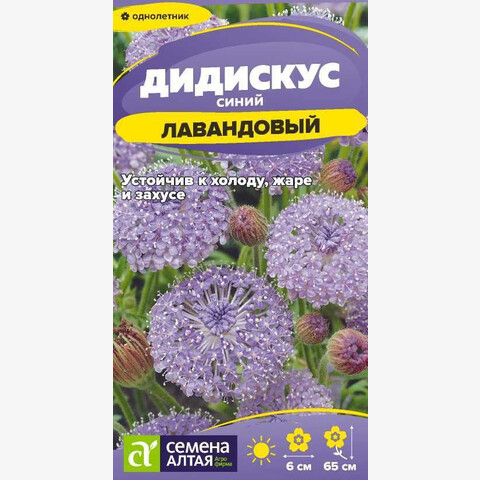 Холодостойкое и устойчивое к засухе растение высотой 50-65 см, с красноватыми стеблями и оригинальными рассеченными листьями серовато-зеленого цвета. Кружевные соцветия-зонтики лавандовой окраски, диаметром 5-6 см, источают еле уловимый аромат. Применяется преимущественно в пестрых цветниках. Дидискус хорошо сочетается с другими растениями голубой, зеленой и серовато-белой гаммы. Не выносит избытка влаги, требует дренированных почв, устойчив к болезням. Срок посева семян на рассаду март-апрель. Семена высевают за 6-8 недель до высадки (высадку производят после последних заморозков), посев производят на глубину 2 мм и проращивают при температуре +16...+21°С, всходы появляются через 10-28 дней. В фазе одного-двух настоящих листочков сеянцы пикируют. В открытый грунт рассаду высаживают после того, как минует угроза заморозков на расстоянии 20-25 см. Цветение наступает через 110-120 дней после появления всходов, с июля по сентябрь. Полив умеренный, но регулярный, обычно достаточно поливать 1 раз в неделю. Подкармливают 2-5 раз в течение лета полным минеральным удобрением. Отцветшие соцветия обрезают для продления цветения.