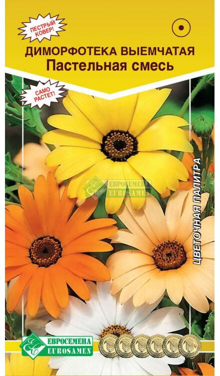 Диморфотека – эффектный, яркий и неприхотливый цветок из семейства Сложноцветных (Астровых), родилась в песках южной Африки, в народе ее называют капский ноготок. Однолетнее растение образует прямостоячие, сильноветвистые, полушаровидные кустики, на них распускается около 30-ти изящных, крупных, ромашковидных соцветий-корзинок с контрастным темно-коричневым пятном у основания лепестков. Выращивание диморфотеки из семян – занятие нетрудное и увлекательное, в ответ на минимальные усилия со стороны садовода, африканская ромашка, как еще называют эту культуру, подарит пестрый ковер из разноцветных и невероятно трогательных цветов, и будет радовать своей декоративностью на протяжении всего лета. Используется для оформления клумб, рабаток, каменистых садиков, подходят для выращивания в горшках и балконных ящиках. Высота растения-30 см Диаметр цветка-5-7 см