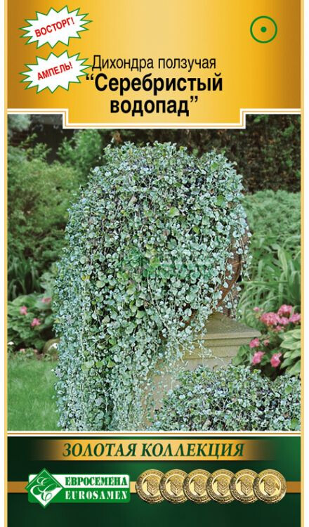 Встречайте! Перед Вами еще одна яркая представительница структурных растений! Необыкновенная серебристая окраска листьев пленит своей нежностью и изяществом, создает романтическое настроение, служит прекрасным украшением клумб и просто очаровательна в подвесных кашпо. Плети дихондры достигают 0,9-1,5 метров в длину. Отличный почвопокровник Серебристый водопад лучше проявляет оттенки цвета листьев на открытом месте, в тени зеленеет и уже меньше напоминает пенные струи воды. Растение многолетнее, но в наших широтах культивируется в однолетней культуре и является прекрасным дополнением к ассортименту серебристых растений, среди которых у нас лидирует однолетняя цинкерария приморская.