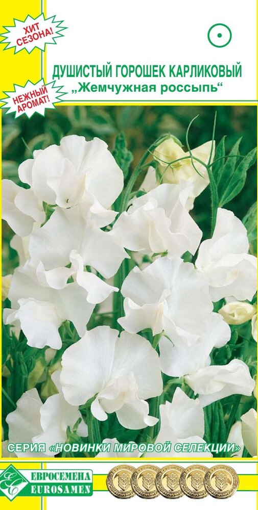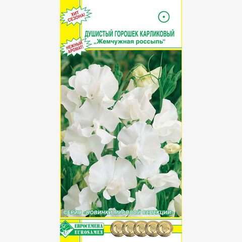 КОРОЛЬ ЛЕТНИКОВ! Благодаря неповторимому аромату, изысканному строению цветков, обильному и продолжительному цветению, душистый горошек по праву считается одним из наиболее красивых и любимых растений. Встречайте – душистый горошек-карликан! Невысокие, многостебельные растения широко используют для оформления балконов и как горшечную культуру. Нежные, душистые цветки белого жемчужного цвета собраны по 3-4 штуки в изящные кисти. Регулярная срезка отцветших соцветий и завязей способствует удлинению периода цветения. Необычайно стойкие цветки, долго не увядающие и сохраняющие свежесть и свою окраску гарантируют Вам бесконечное удовольствие.