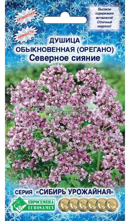 Душица – род растений, который относится к семейству Яснотковые. Одна из самых популярных разновидностей – душица обыкновенная, более известная как специя орегано. Эта трава имеет не только приятный пряный аромат, который используется в кулинарии. Она также обладает полезными свойствами, в народной медицине используется в качестве настоев, отваров как успокоительное и антибактериальное средство, также при простудных заболеваниях. Рекомендуется для использования листьев и молодых побегов в свежем и сушеном виде как приправы к овощным блюдам, для приготовления чайных напитков и при консервировании. Душица – обязательный компонент ароматных смесей для производства мясных изделий, колбас, паштета, ливера. Ее добавляют в соусы и подливки. Северное Сияние - многолетнее растение. Срезку зелени проводят со второго года жизни. Период от массового отрастания до начала цветения (первой срезки) 62 дня. Растение высотой 50 см, прямостоячее. Стебли многочисленные, облиственность хорошая. Лист темно-зеленый, овальный, края ровные. Цветок мелкий, пурпурно-розовый. Урожайность зеленой массы 1 кг/кв.м.