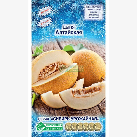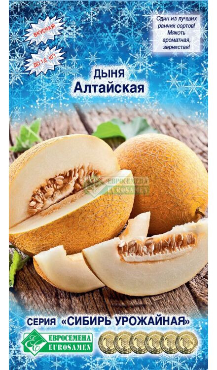 Дыня — не только вкусное лакомство, но ещё и кладезь витаминов и минералов, которые могут помочь восстановить полезные запасы человеческого организма. Она обладает омолаживающими свойствами, благотворно влияет на кишечную микрофлору, улучшает процесс пищеварения. Её мякоть содержит вещества, помогающие выработке серотонина – гормона счастья. Дыня нашла свое активное применение в лечебном питании: её используют при малокровии, сердечно-сосудистых заболеваниях, болезнях печени и почек, а также подагре и ревматизме. Алтайская- скороспелый сорт с ярким дынным ароматом (65-75 дней). Плоды овальные, массой 0,8-1,6 кг. Поверхность плода гладкая или слабо сегментированная, у зрелого плода лимонно- оранжево-желтого цвета, без рисунка. Кожица тонкая, мягкая. Мякоть светло-оранжевая или белая, тонкая, зернистая, ароматная. Устойчива к пониженным температурам.
