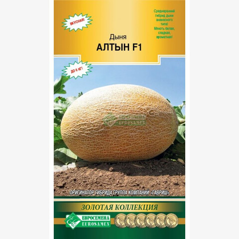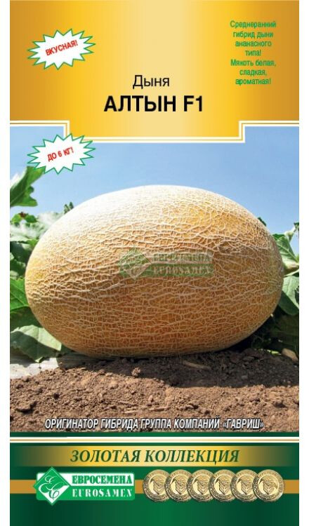Дыня — не только вкусное лакомство, но ещё и кладезь витаминов и минералов, которые могут помочь восстановить полезные запасы человеческого организма. Она обладает омолаживающими свойствами, благотворно влияет на кишечную микрофлору, улучшает процесс пищеварения. Её мякоть содержит вещества, помогающие выработке серотонина – гормона счастья. Дыня нашла свое активное применение в лечебном питании: её используют при малокровии, сердечно-сосудистых заболеваниях, болезнях печени и почек, а также подагре и ревматизме. Алтын- среднеранний гибрид с плодами ананасного типа. Плоды желтого цвета, массой 3-6 кг. Мякоть белая, сладкая и очень ароматная. Гибрид отличается жаростойкостью, комплексной устойчивостью к болезням, отличной транспортабельностью.