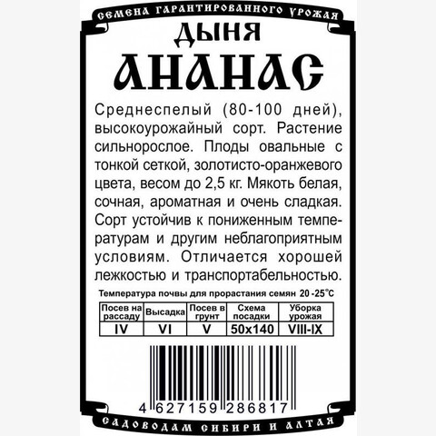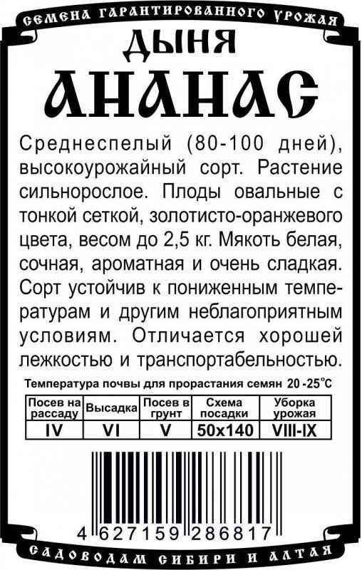 Среднеспелый (80-100 дней), высокоурожайный сорт. Растение сильнорослое. Плоды овальные с тонкой сеткой, оранжевого цвета, весом до 2,5 кг. Мякоть белая, сочная, ароматная и очень сладкая. Сорт устойчив к пониженным температурам и другим неблагоприятным условиям. Отличается хорошей лежкостью и транспортабельностью.