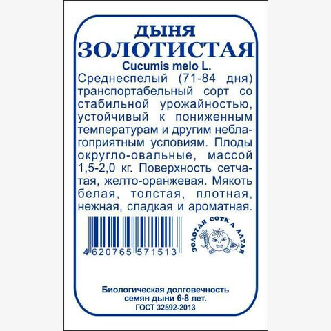 • Сорт среднеспелый, урожайный. Срок созревания 70-85 дней. Растение среднеплетистое, с небольшим количеством плетей. Плоды округло-овальные, массой 1,5-2,0 кг, желто-оранжевые, сетчатые, без рисунка. Кора средней толщины, кожистая. Мякоть белая толстая, сладкая, очень ароматная. Сорт устойчив к пониженным температурам и другим неблагоприятным условиям.