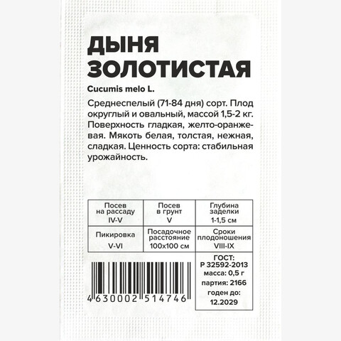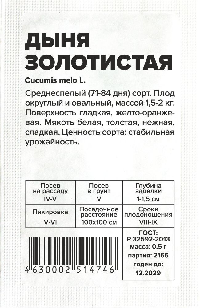 Среднеспелый (71-84 дня) сорт. Плод округлый и овальный, массой 1,5-2 кг. Поверхность гладкая, желто-оранжевая. Мякоть белая, толстая, нежная, сладкая. Ценность сорта: стабильная урожайность. Место посадки: предпочитает плодородные рыхлые нейтральные почвы. Размещают после капусты, лука, бобовых. Не рекомендуется сеять после других растений семейства тыквенных (тыква, огурец, кабачок, арбуз), подсолнечника, картофеля Освещение: обильное, переносит легкое затенение Предпосевная подготовка: семена замачивают в 0,5% растворе марганцовки на 15 минут. Допускается предварительное проращивание во влажной ткани или посев сухими семенами без подготовки Сроки посева: на рассаду за 20-25 дней до высадки (апрель-май), в открытый грунт после прогревания почвы до 15..18°С на глубине 15 см (май-июнь) Посев на рассаду: семена раскладывают на выровненный уплотненный теплый очень влажный грунт в рассадные ящики или индивидуальные емкости объемом 0,5 л. Присыпают слоем почвы 0,8-1 см и хорошо уплотняют, аккуратно поливают теплой водой, накрывают пленкой. Пророщенные семена присыпают рыхлым грунтом без уплотнения Посев в грунт: семена раскладывают на теплый увлажненный грунт, присыпают землей на 1-1,5 см и хорошо уплотняют, накрывают пленкой (пророщенные семена не уплотняют, присыпают слоем земли 2,5-3,0 см) Пикировка/перевалка: рассаду высаживают, когда минует угроза возвратных заморозков (май-июнь), в возрасте 3-4 настоящих листьев. В открытом грунте дыню высаживают по схеме 100х100 см, в теплицах — 70х70 см с использованием шпалер. На приусадебных участках возможно выращивание дыни путем её прививки на тыкву Уход: почва под растениями всегда должна оставаться увлажненной. Подкормки проводят при наличии симптомов дефицитов питания. При выращивании в теплице необходимо обеспечивать проветривание